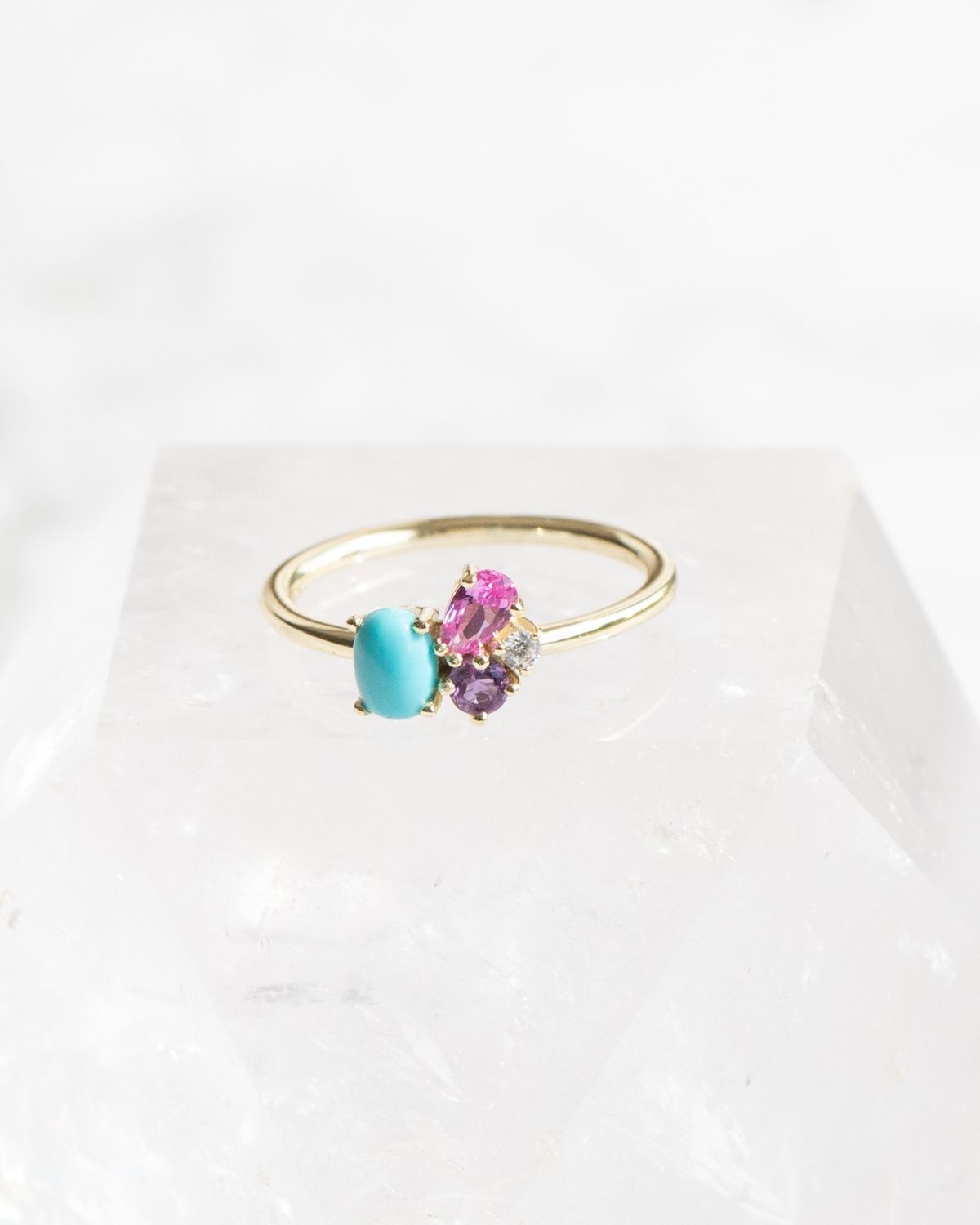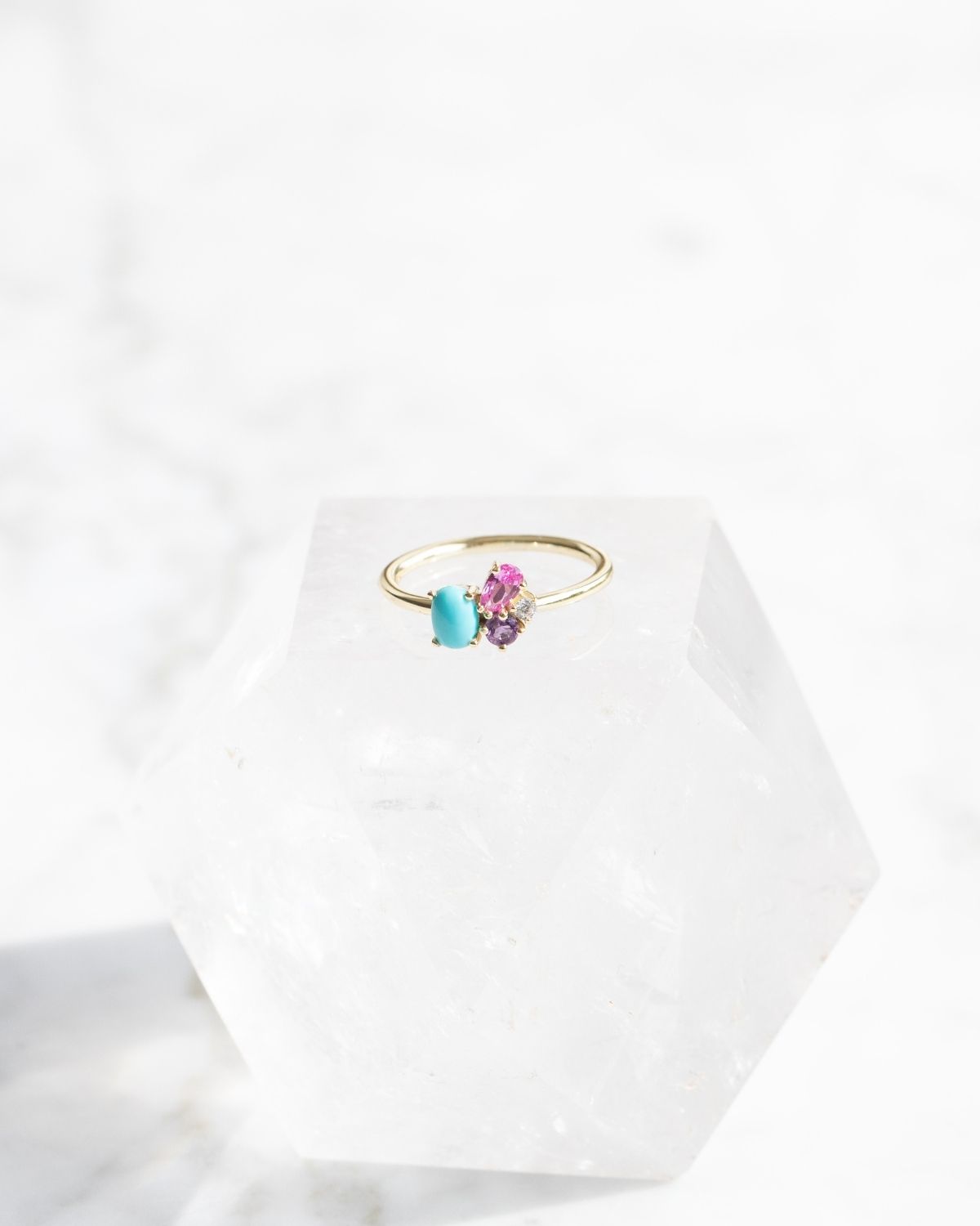 Ein Ring, handgefertigt aus 925 Sterling Silber mit 18k Gold-Finish und besetzt mit echten Edelsteinen: einem Türkis, einem Amethyst, einem Spinell und einem Topas.