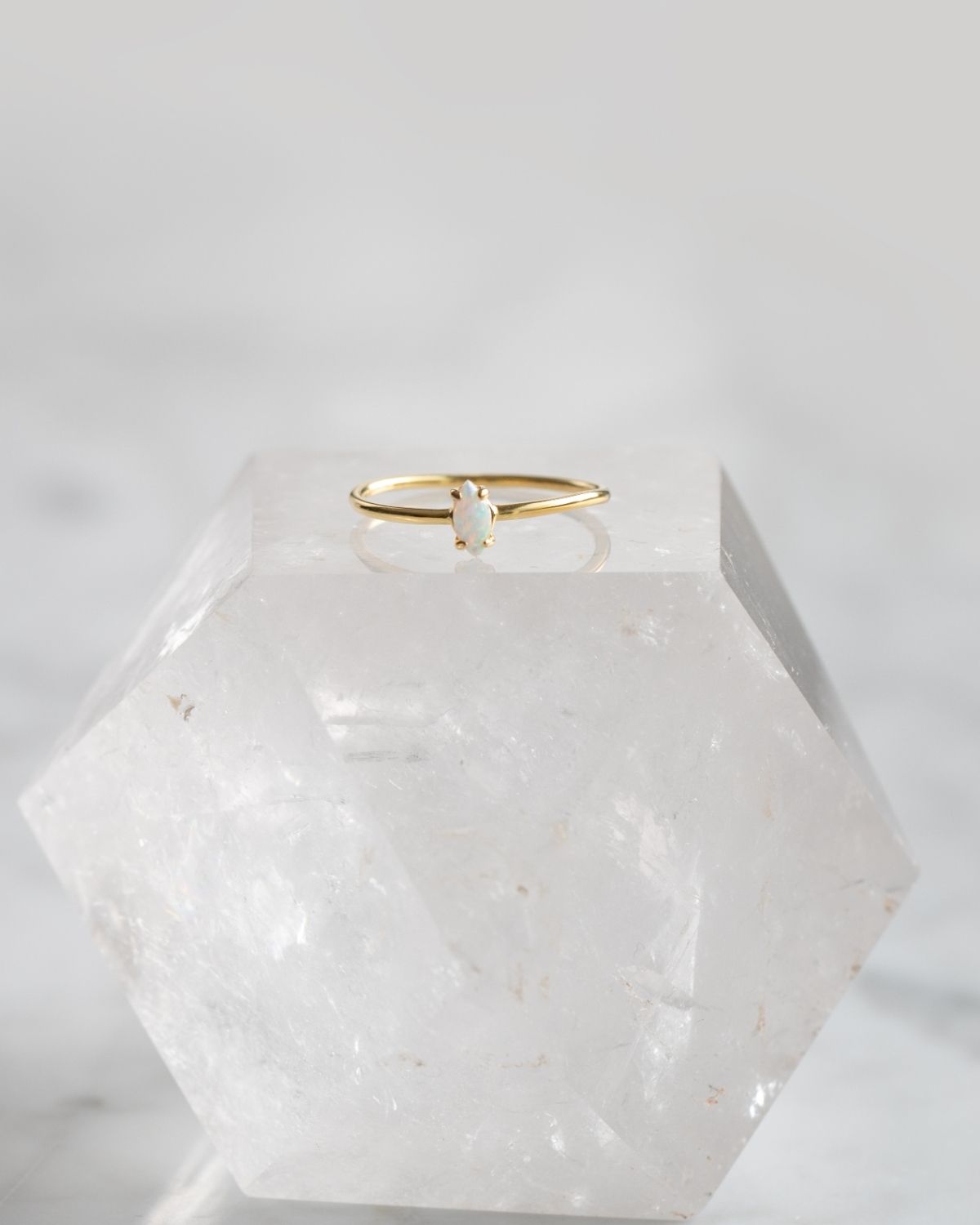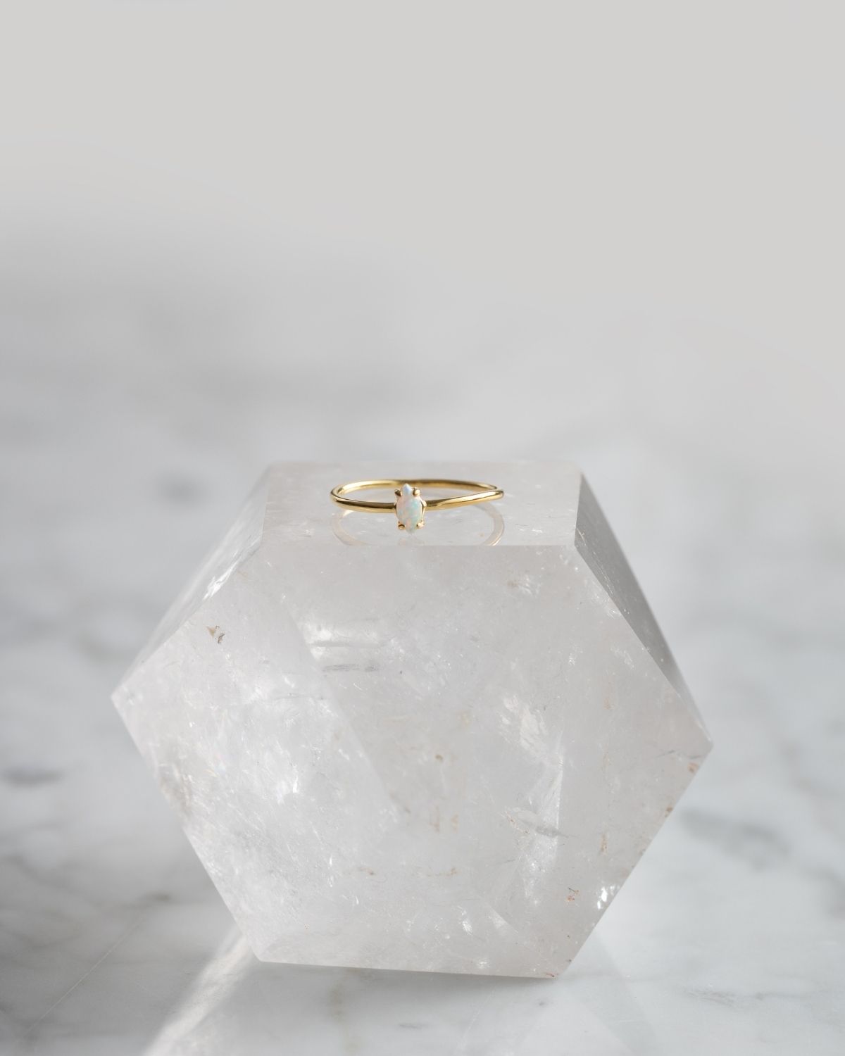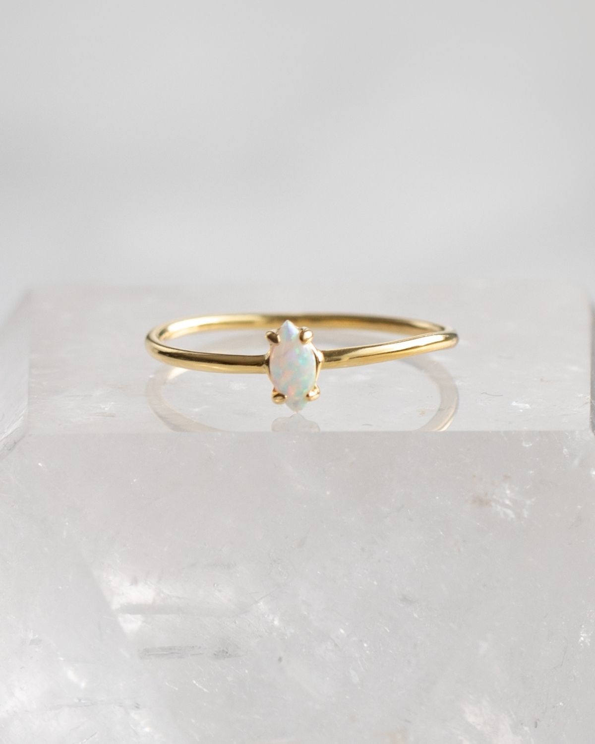 Dieser zierliche Ring aus 925 Sterling Silber, veredelt mit hochwertiger 18k Vergoldung, besticht durch einen kleinen, echten Opal in feinem Schliff.